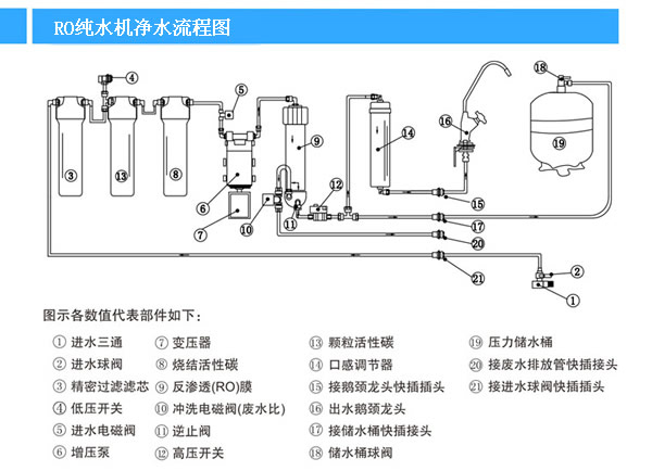 - RO凈水機是采用RO膜凈化污水的凈水產(chǎn)品,對RO凈水機專業(yè)知識你知道多少?RO凈水機配件種類:水龍頭,壓力桶,水管,接頭(球閥),機殼,泵,PP濾芯,活性炭濾芯,RO膜,廢水比,逆止閥,高壓開關,低壓開關等。RO凈水機凈水流程:
