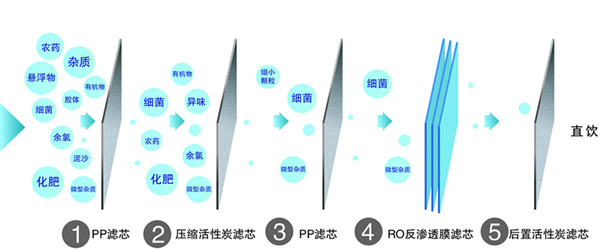 原水通過水管進入RO凈水機的前三級濾芯進行初濾,然后在由增壓泵對水施壓,讓水流RO反滲透膜中,通過RO膜的逆滲透效果精細凈化水源,然后在將水輸送到壓力桶,由壓力桶保存;當需要使用時在打開壓力桶球閥,通過壓力桶施壓讓水流入最后一級T33濾芯(活性炭濾芯,主要為凈化水質口感),在通過鵝頸水龍頭產(chǎn)水詳情可參考凈水機原理。RO凈水機凈水特點:1、采用反滲透技術(RO膜),分離自來水中細微雜質、細菌、重金屬、礦物質污染、化學污染和其他有害物質等,然后在通過T33濾芯分解純水中營養(yǎng)物,提升水質口感和健康。產(chǎn)水干凈,安全,可直接飲用。