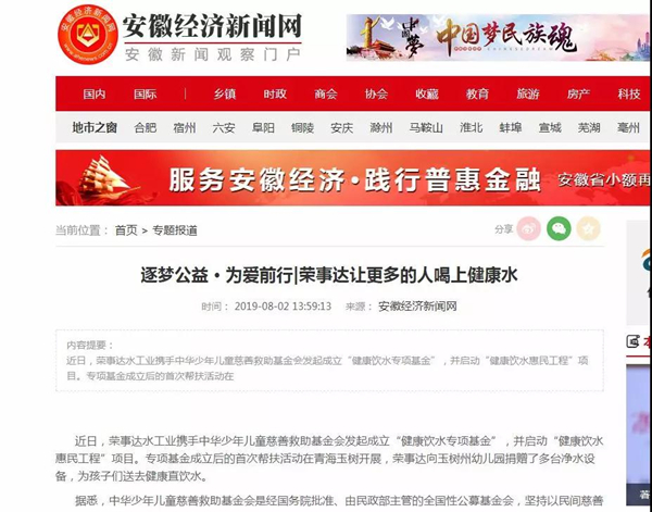 安徽經(jīng)濟(jì)新聞網(wǎng) 《逐夢(mèng)公益 · 為愛前行|榮事達(dá)讓更多的人喝上健康水》
