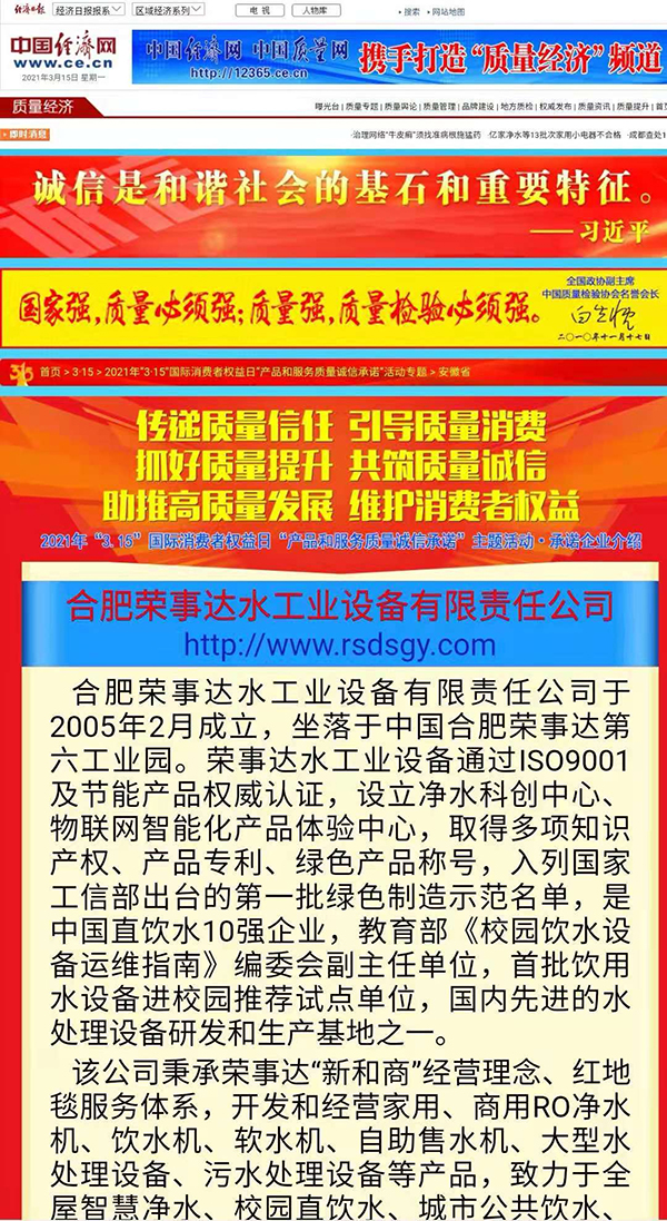 作為凈水行業(yè)領(lǐng)軍企業(yè),榮事達(dá)積極響應(yīng)中國質(zhì)量檢驗協(xié)會“產(chǎn)品和服務(wù)質(zhì)量誠信承諾”號召,面向廣大用戶做出相關(guān)產(chǎn)品和服務(wù)質(zhì)量誠信承諾,體現(xiàn)了企業(yè)應(yīng)有的社會責(zé)任和擔(dān)當(dāng)。本次評選,需要對2000余家企業(yè)的誠信、質(zhì)量情況進(jìn)行調(diào)查,并結(jié)合社會評價,再由權(quán)威專家層層嚴(yán)格篩選專業(yè)審核。榮事達(dá)從中脫穎而出,一舉獲得“全國產(chǎn)品和服務(wù)質(zhì)量誠信示范企業(yè)”“全國質(zhì)量信得過產(chǎn)品”“全國凈水行業(yè)質(zhì)量領(lǐng)先品牌” “全國質(zhì)量誠信先進(jìn)企業(yè)”四項殊榮,相關(guān)承諾和獲獎情況已在《中國質(zhì)量網(wǎng)》、《中國經(jīng)濟(jì)網(wǎng)》、《中國消費(fèi)網(wǎng)》在線發(fā)布。該項活動也得到《人民網(wǎng)》、《新華網(wǎng)》、《光明網(wǎng)》、《新浪》、《搜狐》、《今日頭條》等主流網(wǎng)絡(luò)媒體的報道。